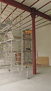 01.10.2019 Rostschutzanstrich auf der zentralen Säule und den Deckenträgern des großen Saals. In der Raumecke lässt sich deckenseits der für die Treppe zum Dachgeschoss erforderliche Durchbruch erkennen. |