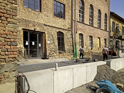09.04.2020 Arbeiten an den Außenanlagen auf der Südseite vor dem Getreidelager und dem Brauhaus. |