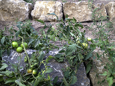 19.08.2020 Die am "Amphitheater" oberhalb des Parkplatzes aufgeschüttete Erde war offensichtlich voller Tomatensamen: Überall wachsen nun völlig ohne Pflege die Sträucher, und sie sind bereits über und über mit Früchten behängt ... |