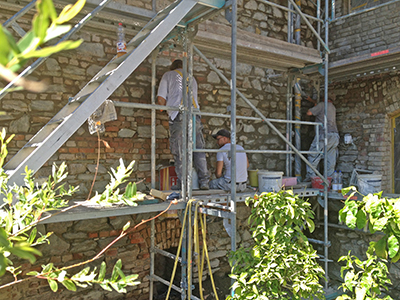 Fassadenarbeiten am Natursteinsockel auf der Südseite des Turms. |