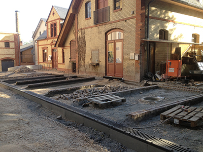 Aus Pflastersteinen verlegte Abgrenzungsmarkierungen für die Parkplätze vor dem Pferdestall. |