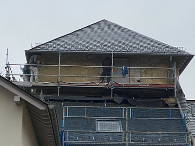 Der alte Putz an der Nordfassade des Turms wird entfernt. |