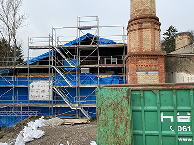 18.02.2021 Das mit Schadstoffen belastete Dach des Kühlschiffs wird abgedeckt. |