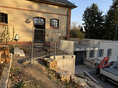 01.03.2021 Die Stahlbrücke zur Entfluchtung der Terrasse des Getreidelagers wird angeliefert und montiert. |
