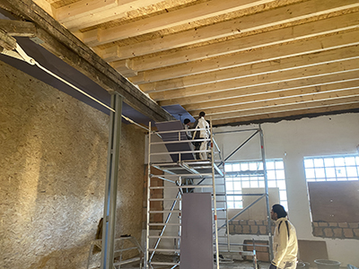 Beginn der Beplankung an der Holzbalkendecke des Kühlschiffs. |