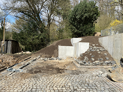 Neupflanzung mit "Bodendeckern" an der kleinen Terrasse des Pferdestalls und Neuanlage des Hangs seitlich der ehemaligen roten Garage. |