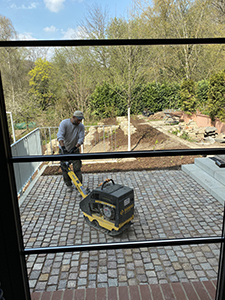 21.04.2021 Verdichtung des Pflasters auf der kleinen Terrasse des Pferdestalls. |