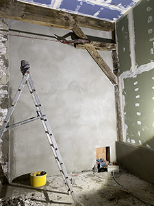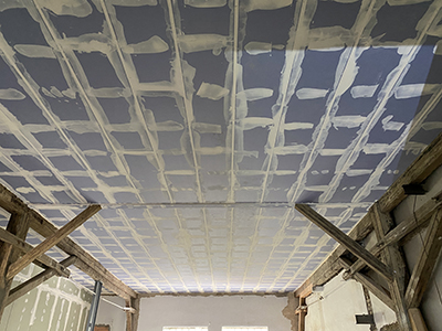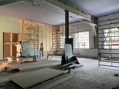 03.05.2021 Montierte und gespachtelte Brandschutzdecke im Veranstaltungsraum des Kühlschiffs. |