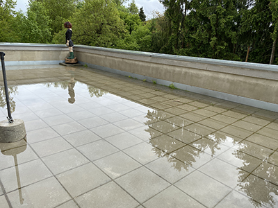 26.05.2021 Verstopfte Fugen verhindern nach einem starken Regen das Abfließen des Wassers von der Terrasse über dem Getreidelager ... |