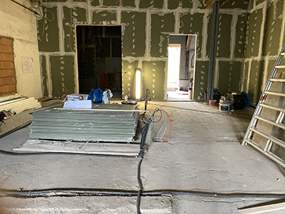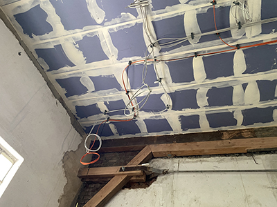 15.06.2021 Gespachtelte Rigipsplatten im Kühlschiff an den Wänden und an der Brandschutzdecke. Dort befinden sich bereits die ersten Kabelzüge für die Ausstellungsbeleuchtung, die Deckenleinwand und für die Projektorauslässe. |