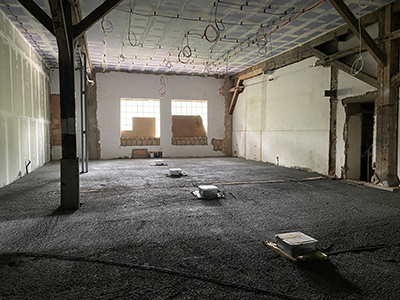 Der frische Ausgleichsestrich im großen Veranstaltungraum des Kühlschiffs. | ||