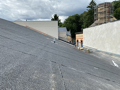 15.07.2021 Mit Dachpappebahnen neu gedecktes Dach des Kühlschiffs. |