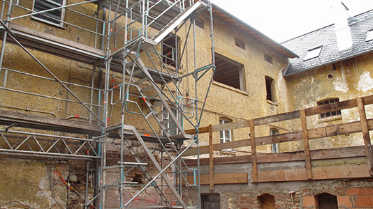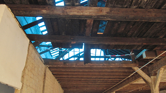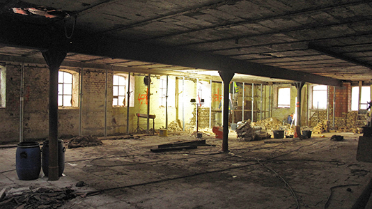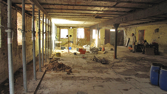 | Obergeschoss des Getreidelagers. Hier werden Vorbereitungen zur kompletten Erneuerung der darüberliegenden Terrassendecke getroffen. | ||||||||