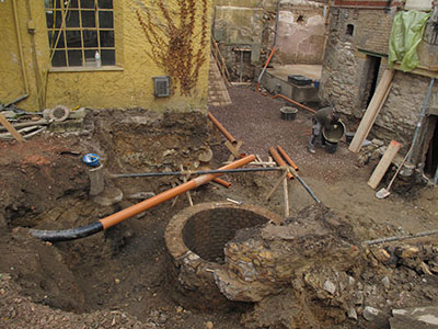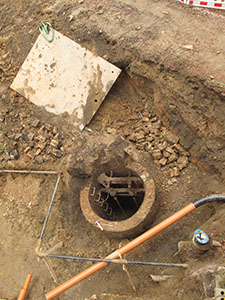 Arbeiten an der Kanalisation im Mühlenhof. Gut zu erkennen: Der neu entdeckte historische Brunnenschacht. | |||