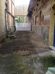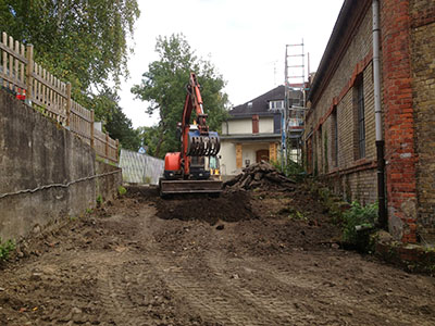 10.08.2016 Nun geht es im Eingangsbereich des Künstlerverein richtig zur Sache: Ein Bagger entfernt die Beläge ... |