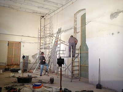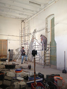 15.08.2016 Nur noch eine paar Rigips-Platten trennen die Arbeiter in unserem neuen Ausstellungsraum vom Durchbruch in die benachbarten Räume. |