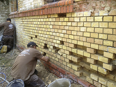 Austausch der beschädigten Ziegel an der Fassade des Sudhauses. |
