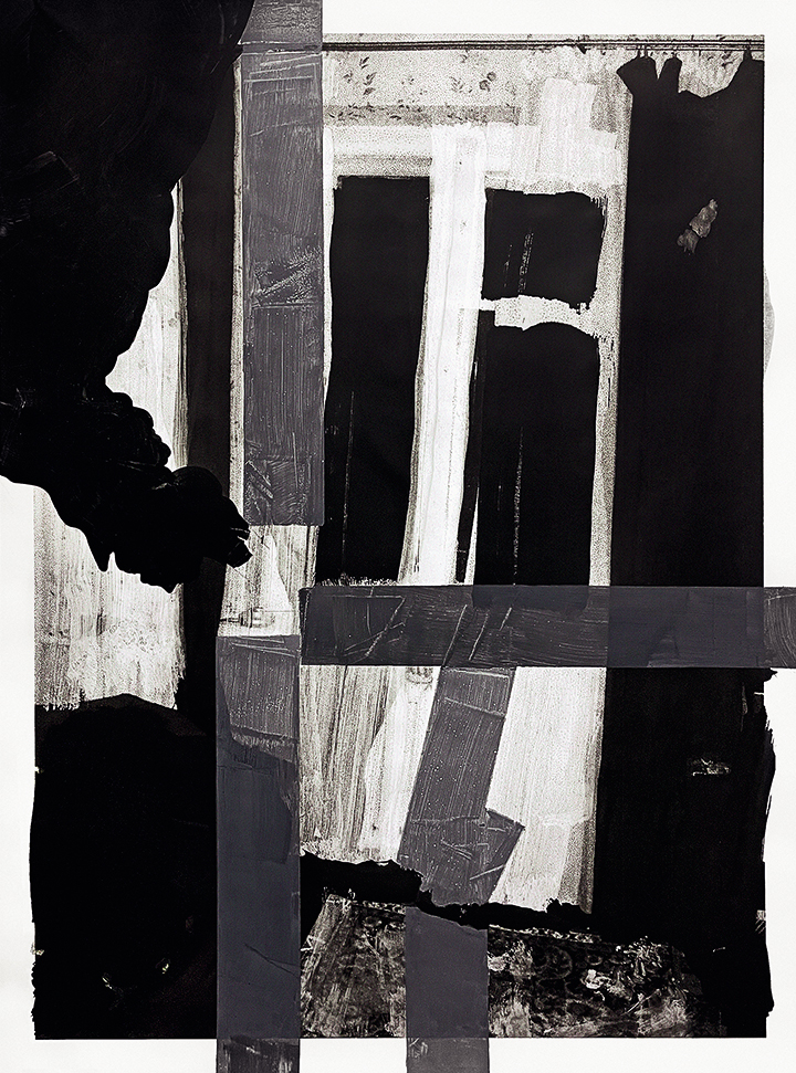 | »Soot/Ruß« aus der Serie »Verloren/Lost«, 2022 Digitaldruck und Acryl auf Synthetikgewebe, ca. 223 x 160 cm |