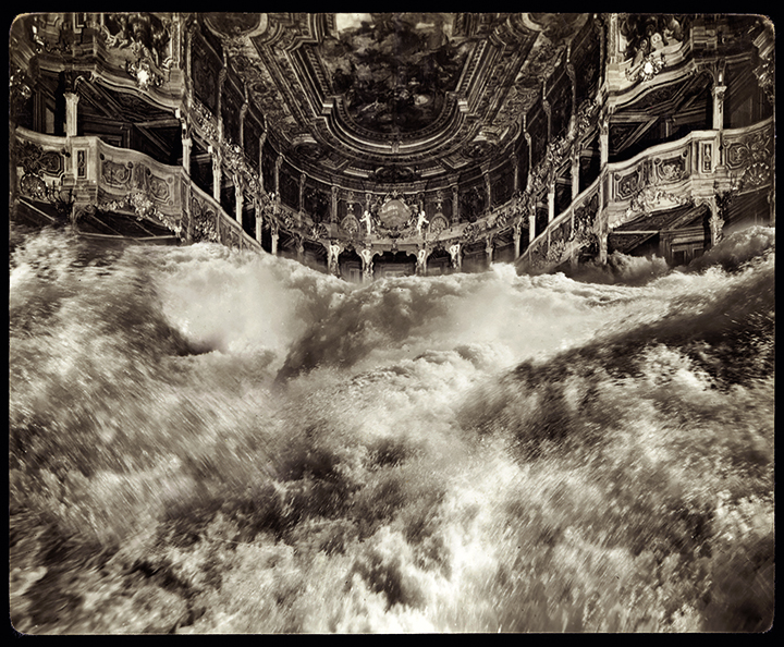 | The halls of Pablo Genovés are filled with thunderous noise: Masses of water rage, rotating in mighty waves and whirlpools through the baroque architecture of magnificent palaces, libraries and picture galleries. Gilded stucco elements, ceiling paintings, cartouches, volutes, friezes, pilasters and domes quote the formal language of civilisation, prosperity and artistic sensibility. It is not clear what catastrophe is currently underway. A massive tsunami that reaches into the heart of France or Italy? End of the world à la Hollywood? Or are we just looking at a nightmare? An inner state of being torn away and washed away? When mental states erupt and shoot into the blood. When there is no end to it, and all reason is lost, the person drowns in their inner memories or desires. When all at once a trauma is rekindled and reeling panic washes over every foothold. |