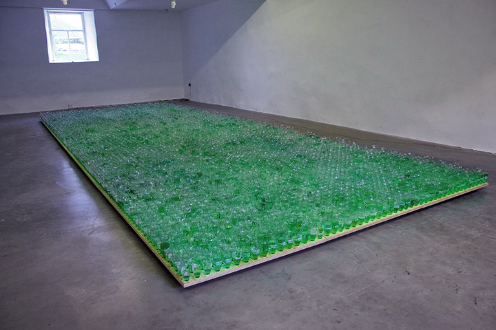 | »Lawn«, 2016-2023 Zerbrochene Flaschen mit Flüssigkeit, Holz. Installationsgröße variabel. Ausstellungsansicht 2019 im Wanås Konst Museum, Schweden. Courtesy Galerie Akinci, Amsterdam und Galerie Whatiftheworld, Kapstadt. |